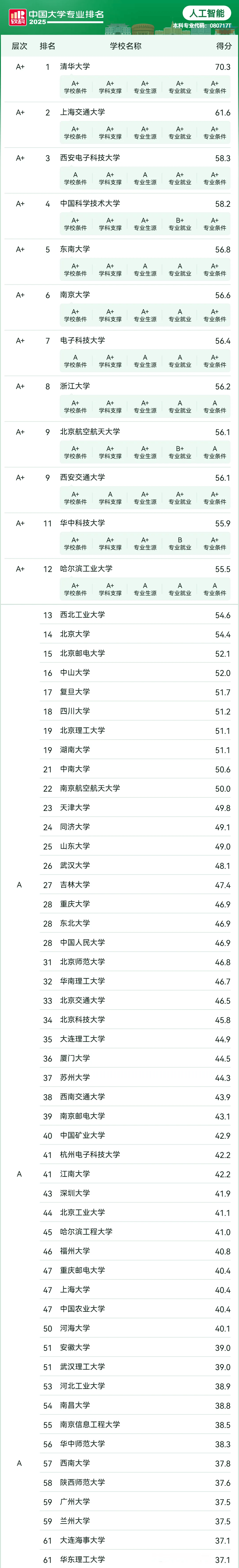 AI 范畴的 “标杆型存正在”,正在计较机视觉竞赛中多次斩获国际冠军。软科的排名系统尤为沉视三大焦点要素:科研硬实力:包罗国度级尝试室、科研项目衔接能力、国际期刊论文颁发量等;2025 年数据显示,从就业市场看,聚焦医工、文工交叉范畴。